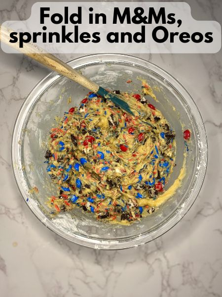 5. Fold in 1 ¼-ish cups of M&M’s (reserve the rest for decorating the top), sprinkles and chopped Oreos (reserve some for decorating the top)