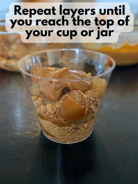 - Layer your parfaits:Layer 1 (on the bottom): About 1 tablespoon graham cracker crumbsLayer 2: A generous spoonful of apple pie fillingLayer 3: A smaller spoonful or drizzle of dulce de leche.Repeat layers 1-3 until you reach the top of the serving jar or cup you're using
