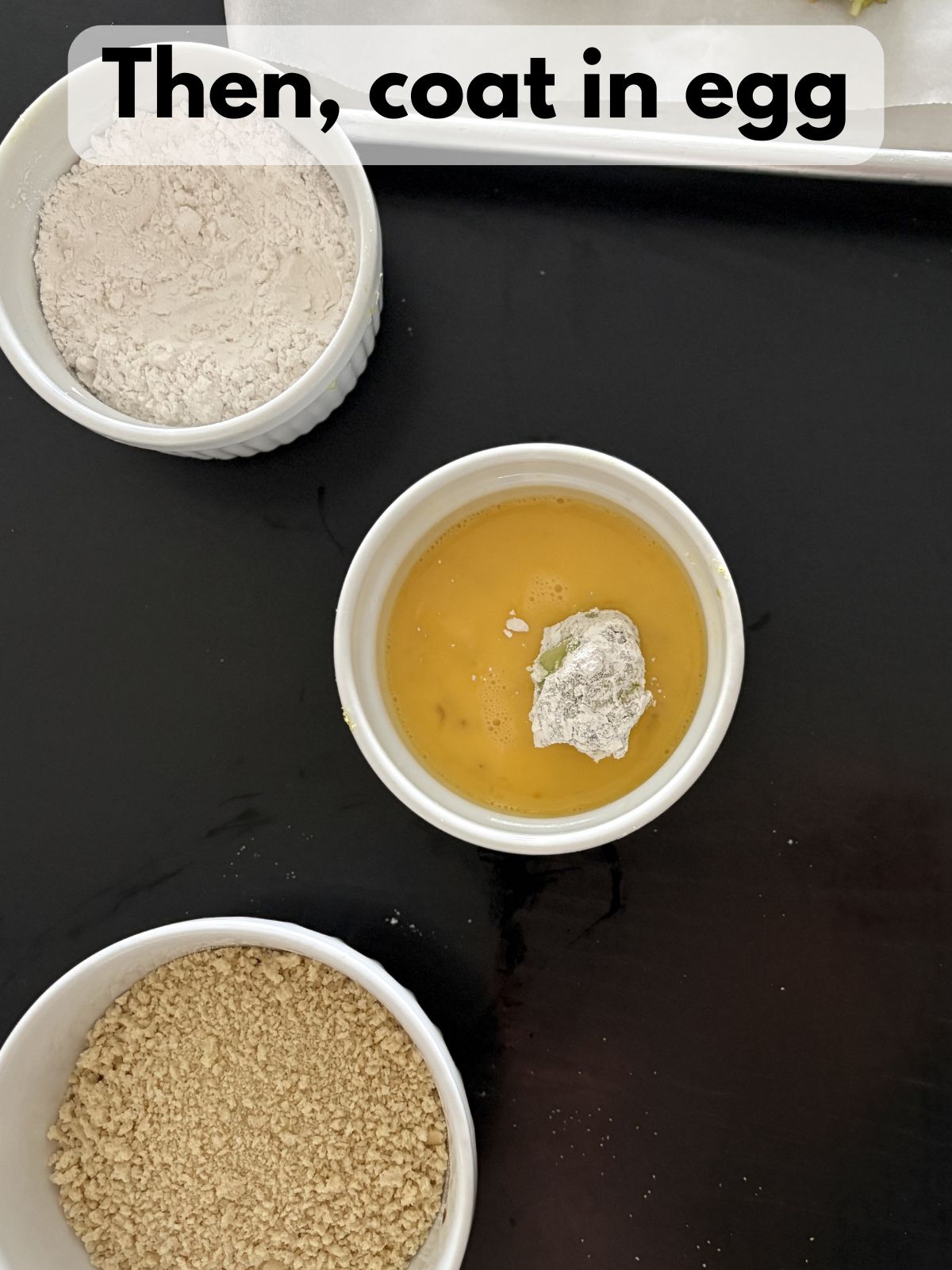 7. Set up three shallow bowls: flour, beaten egg, and panko breadcrumbs. Keep the chilled fritters nearby.