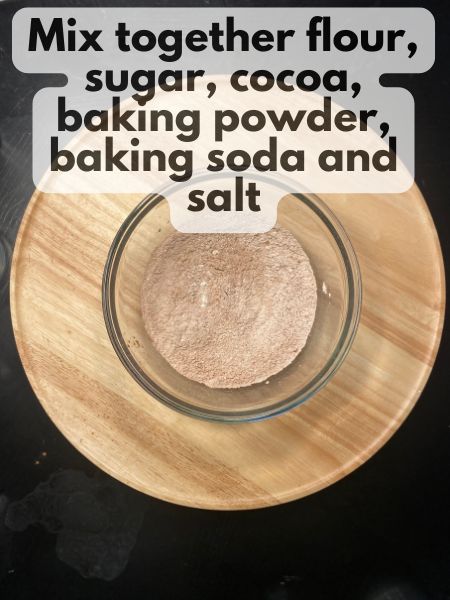 - Mix the Dry Ingredients: In a bowl, whisk together the flour, sugar, cocoa powder, baking powder, baking soda, and salt.