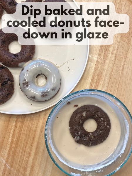 - Once donuts have cooled completely, whisk the powdered sugar, plant-based milk, and vanilla until smooth. Adjust the consistency as needed by adding more milk or powdered sugar.