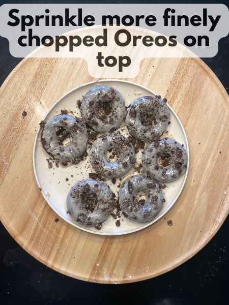 - Decorate Dip the cooled donuts into the glaze and sprinkle with finely crushed Oreos. Let the glaze set for at least 20 minutes.