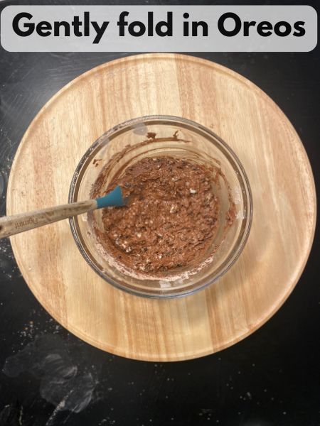 4. Make the Batter: Gradually add the wet ingredients to the dry ingredients, stirring until just combined. Gently fold in the chopped Oreos.