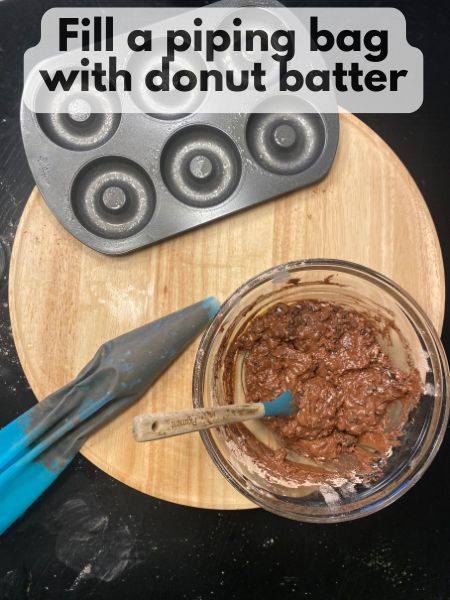 - Fill the Donut Pan: Add batter to a piping bag and pipe the batter into the donut cavities, filling each about 3/4 full.