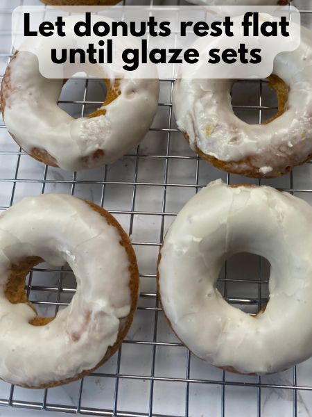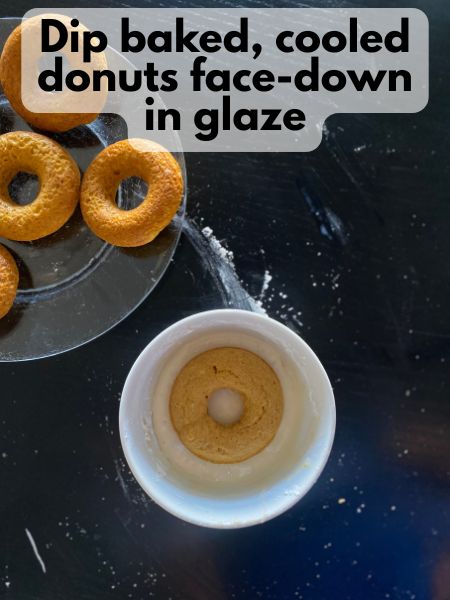 • Once the donuts are cool, dip the tops into the glaze and let the excess drip off. Set them back on a plate or wire rack and let the glaze set for 10–15 minutes before serving.