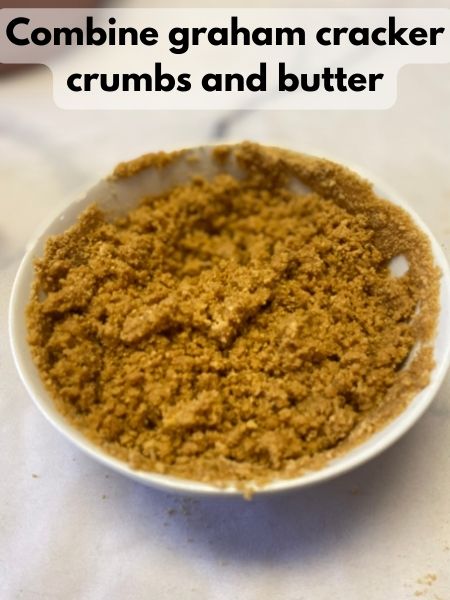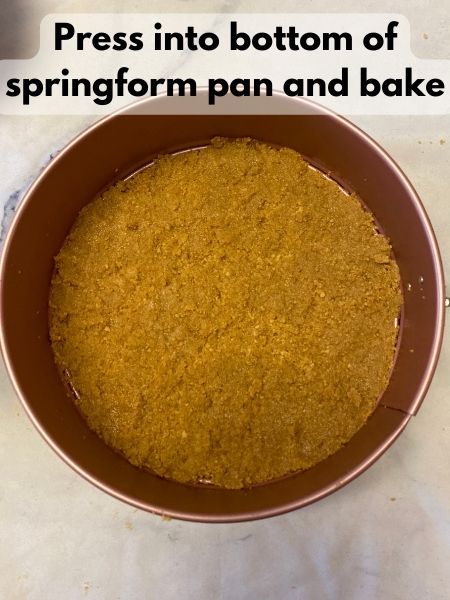 - Combine melted butter and graham crumbs. Press them into the bottom of your springform pan into an even, flat layer.