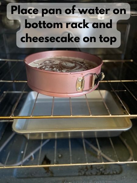 - Place your pan of boiling water on the bottom rack of your preheated oven (Still at 325°F). Place your springform pan with the cheesecake batter on the top rack of your oven.