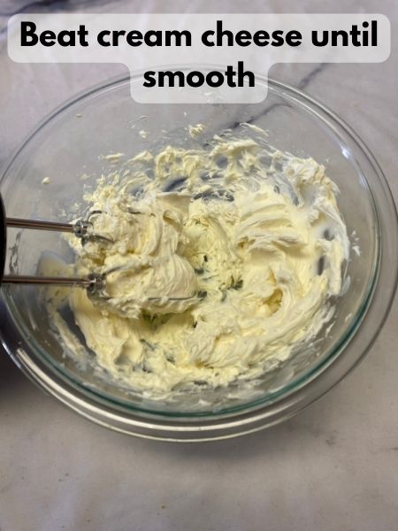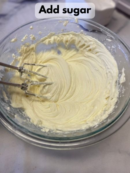 - In a large mixing bowl, beat your softened cream cheese until smooth and creamy. Gradually add the sugar in, and keep beating until smooth.