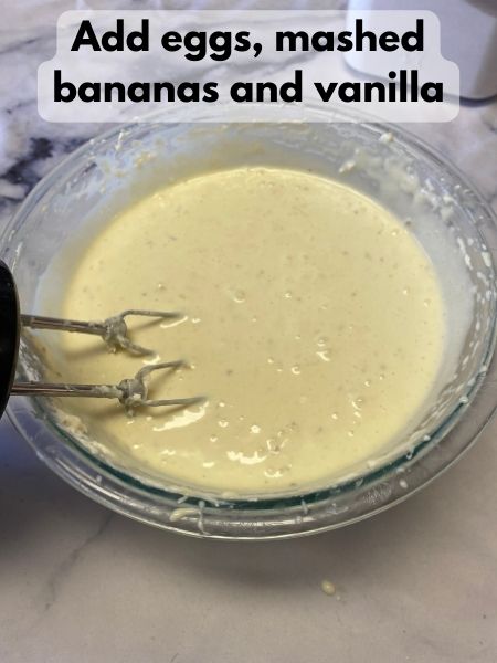 In a mixing bowl, beat the softened cream cheese until creamy. Gradually add sugar and continue mixing until smooth. Incorporate mashed bananas, eggs, and vanilla extract, blending until the batter is velvety and delicious.