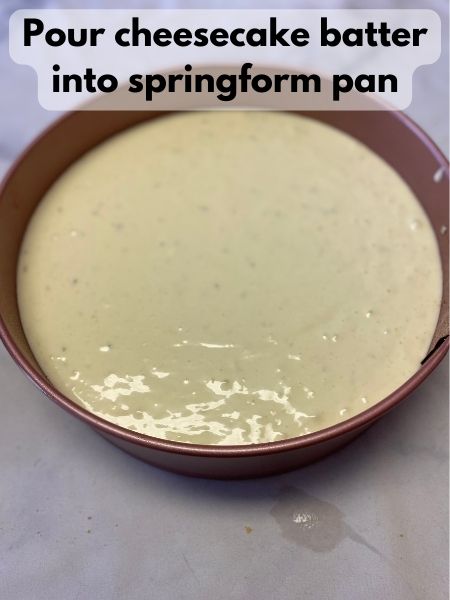 - Pour your cheesecake batter into your springform pan with the crust you just pre-baked.