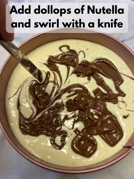 - Place dollops of Nutella on top of the cheesecake batter in the pan and swirl it around with a knife.