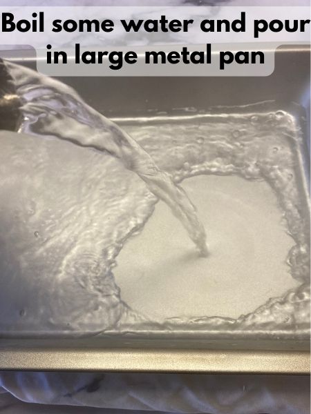 - Boil some water and pour it into a large metal roasting pan. You want about an inch of water in the bottom.