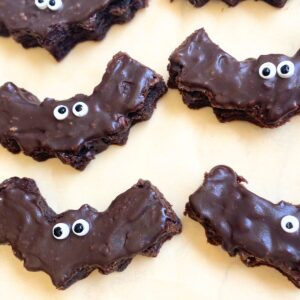 • Use a firm brownie base. Fudgy brownies work great for this, but make sure they’re fully cooled and not too gooey. A slightly underbaked brownie may taste great but won’t hold its shape well when cut into bat shapes.