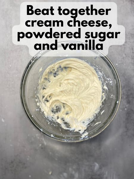 - In a bowl, beat the softened cream cheese until smooth. Add powdered sugar and vanilla extract, then beat again until fluffy.