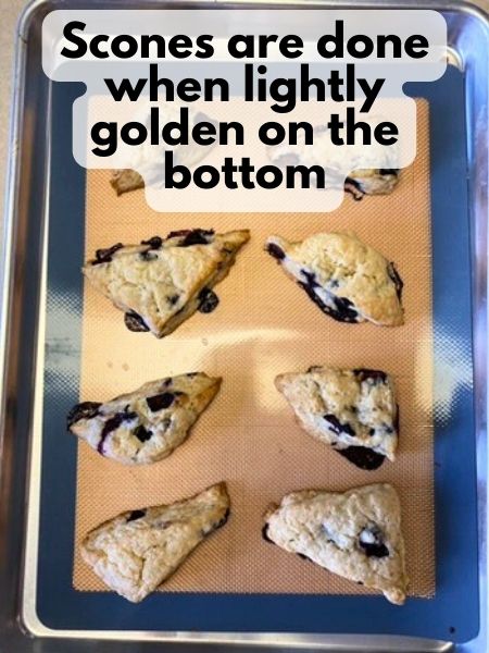 - Bake in the preheated oven for 15-18 minutes, or until the scones are lightly browned on the bottom and cooked through. Allow them to cool on the baking sheet for a few minutes before transferring them to a wire rack to cool completely.