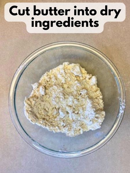 - Add the cold butter cubes to the dry ingredients. Use a pastry cutter or your fingertips to cut the butter into the flour mixture until it resembles coarse crumbs with some pea-sized pieces of butter remaining.