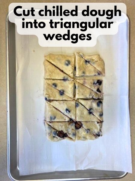 7. Chill your scone dough in the freezer for 30 minutes or the fridge for an hour. I like to use a cookie sheet lined with parchment paper for storing my scones, but then I use a clean piece of parchment paper for baking. Any dough residue left on your parchment paper might burn in the oven and either set off your smoke detector and/or give your finished scones burn marks.