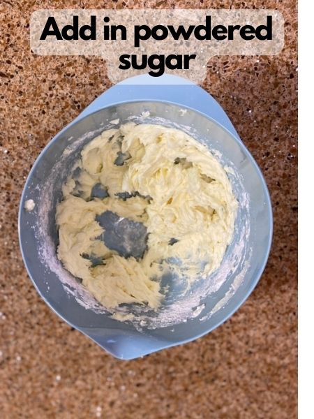 - Add in the powdered sugar, vanilla and salt. Mix until everything is smooth and there are no lumps of sugar or butter