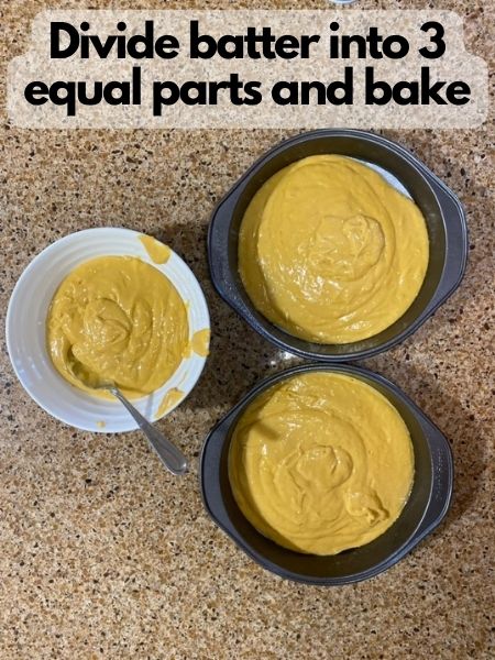 Divide the batter evenly between the prepared cake pans. I only have 2 round cake pans, so I use a measuring cup and spoon the same amount of batter into 2 cake pans and a bowl. Then, I bake the third cake round when the other 2 are done and have cooled.