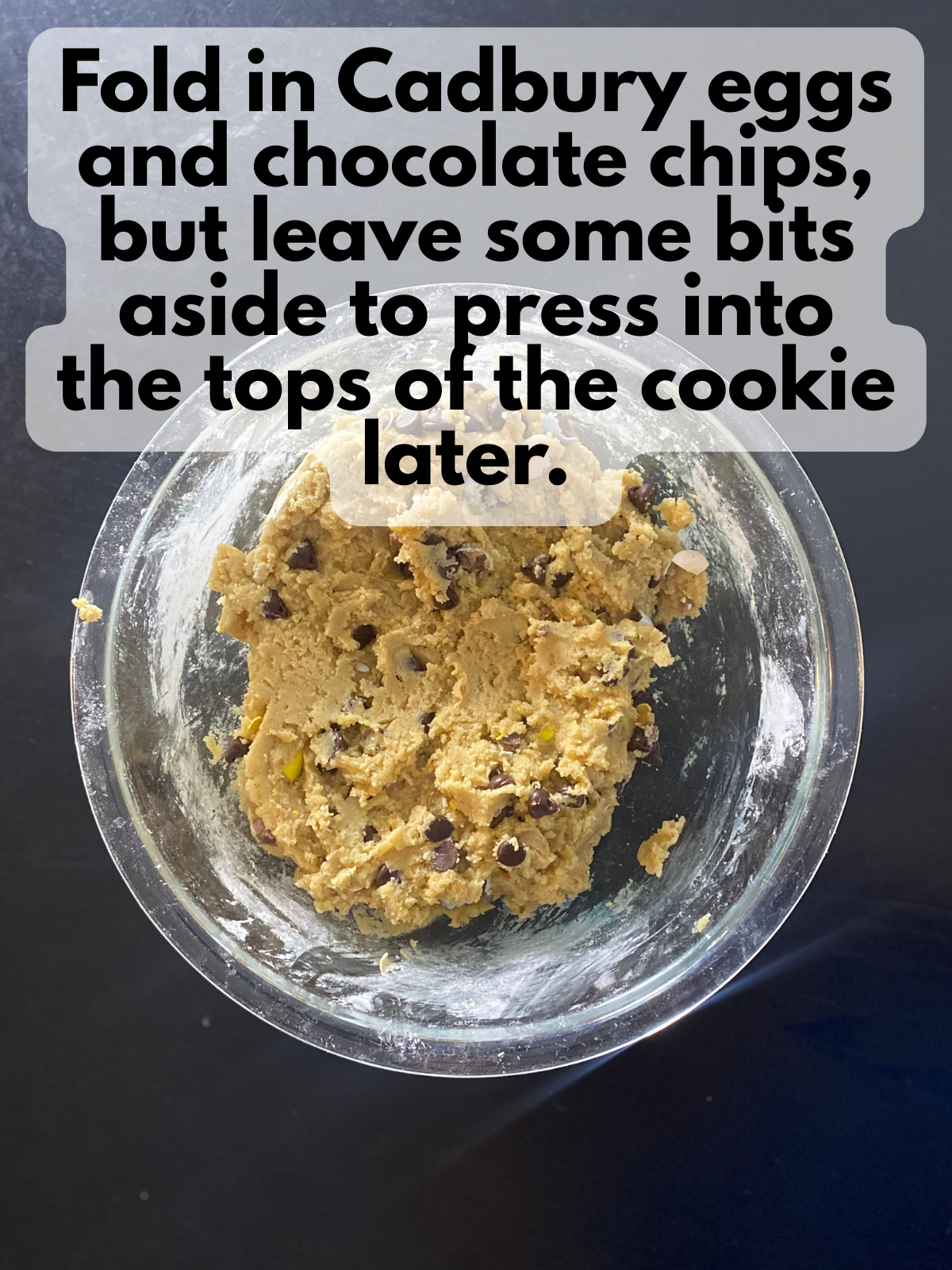 - Fold in the crushed Cadbury Mini Eggs and chocolate chips.