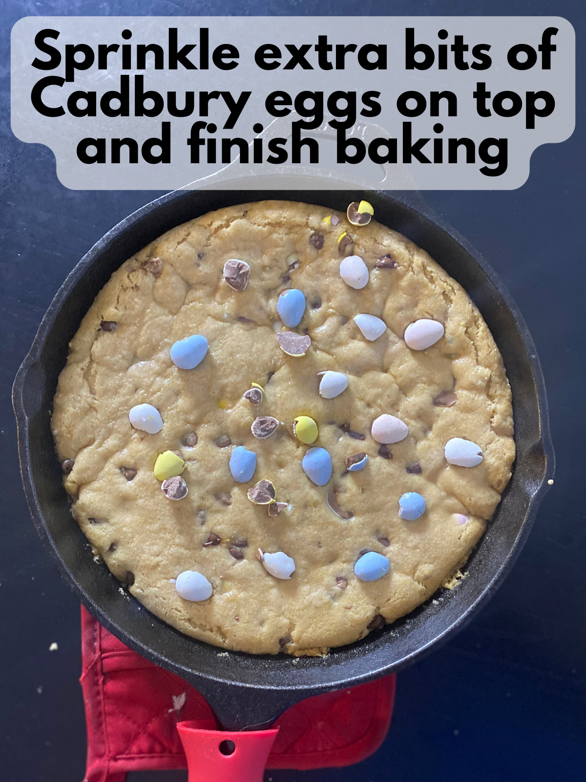 - Pull your skillet out of the oven briefly. Sprinkle the extra chopped Mini Eggs on top and gently press them in so they stay in place, but not much so they sink into the dough.
