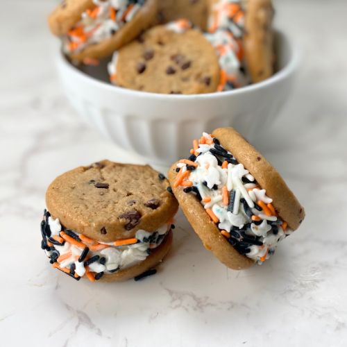 These Halloween Cookie Ice Cream Sandwiches are festive, fun, and easy to make! Just sandwich vanilla ice cream between store-bought cookies, roll in sprinkles, and freeze. A kid-friendly no-bake Halloween dessert that’s perfect for parties!