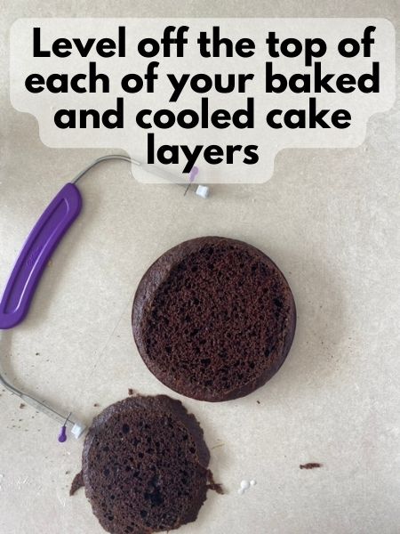 3. After your cake rounds are baked and cooled, use a cake leveler to level off just the top of each layer. If you use only 1 chocolate cake mix, you don’t want your layers to be too thin, so avoid cutting off too much.