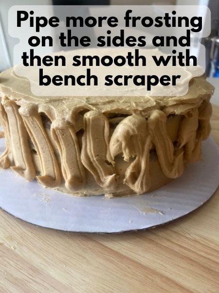 4. Pipe more frosting down the sides of your cake. Use the bench scraper to smooth the frosting. You just want a slightly thicker layer of frosting for this one.