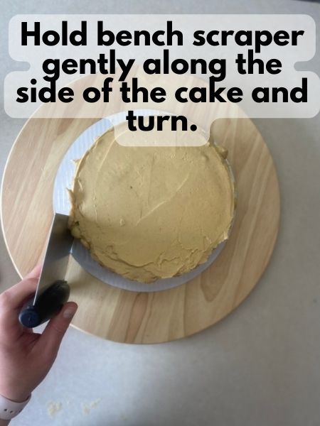 - Hold your bench scraper flat against the sides of your cake. Give your cake a gentle turn on the lazy susan to smooth the frosting on the sides flat.
