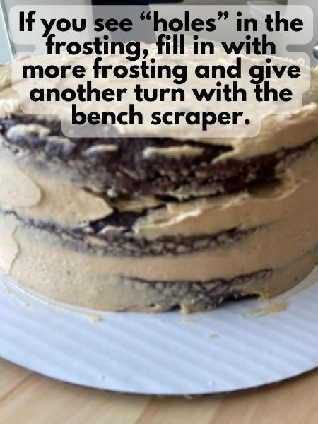 5. Look for any “holes” in the frosting on the sides and fill them in with more frosting. Then, smooth flat. Repeat this process until the sides are smooth.