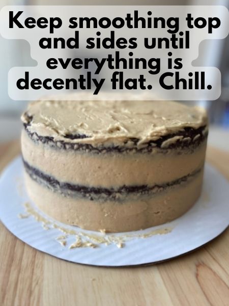 6. Smooth the top of the cake flat too, as needed. Chill your cake again in the fridge for 30 minutes or the freezer for 15 minutes.