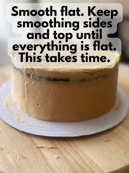 - You'll also have to smooth the top of the cake again. Keep smoothing the sides and top until everything is decently flat.
