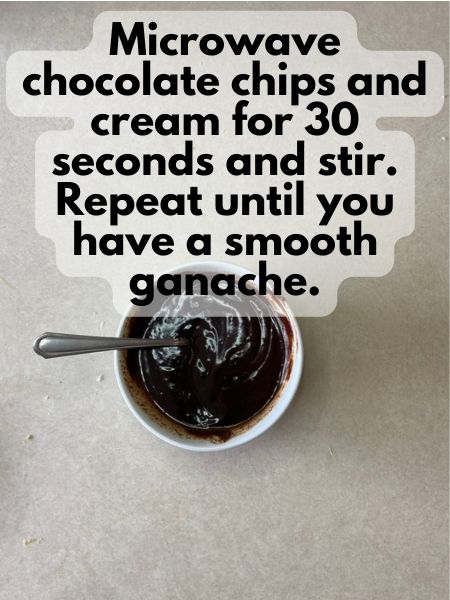 7. Make ganache by microwaving chocolate chips and cream for 30 second increments. Stir between rounds in the microwave. Stop microwaving when you have a smooth ganache with no more chocolate chunks left.