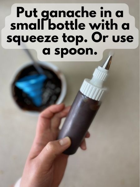8. To create a ganache drizzle, it’s easiest if you put the ganache in a squeeze bottle with a round tip to create some drizzles down the side. I use some small icing bottles I got at Michael’s. If you don’t have something like that, you can also carefully drip some ganache around the edge of your cake with a spoon.