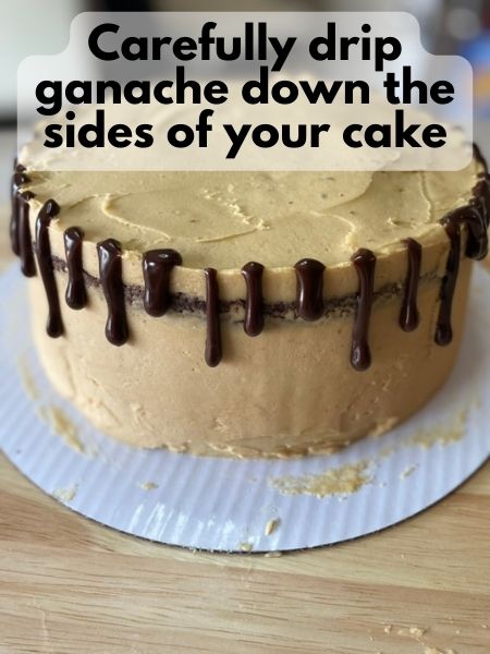 - Place some of your ganache in a squeeze top bottle if you have one. If not, you can use a spoon. Carefully drizzle a little bit of ganache around the edge of your cake on the fop. You don't want the drizzle going all the way down the cake, just an inch or so is fine.