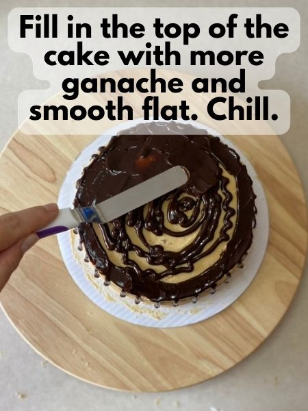 - Then, fill in the top of the cake with ganache and carefully smooth it flat with an offset spatula.