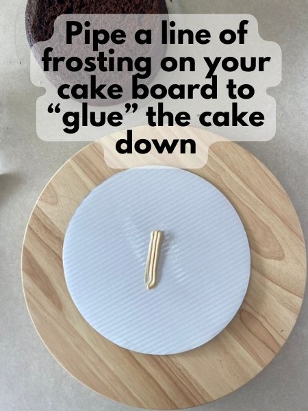 2. Put a small line of frosting on your cake board. This will “glue” your bottom cake layer to the cake board.