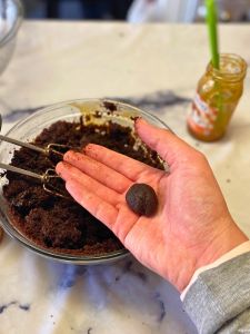 Then, add a generous dollop of that your salted caramel sauce to your cake crumbs. Mix it in until the cake crumbs come together, creating a dough like thick cookie dough or play dough that can hold its shape. I recommend starting with a little caramel sauce and working your way up! You can always add more caramel sauce, but you can’t take it away. However, I did end up using almost my entire 12 ounce jar of caramel sauce.