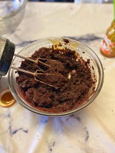 Start by following the instructions on your chosen chocolate cake mix for baking. Again, I recommend you replace any water your box mix calls for with coffee. You can just used a regular 9×13 pan, since we will be crumbling up the cake, anyway.