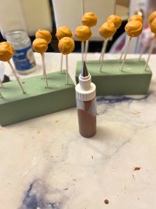- Carefully coat the rest of the cake pop in melted salted caramel candy melt. Leave it upright in a cake pop stand (or styrofoam block) to dry.