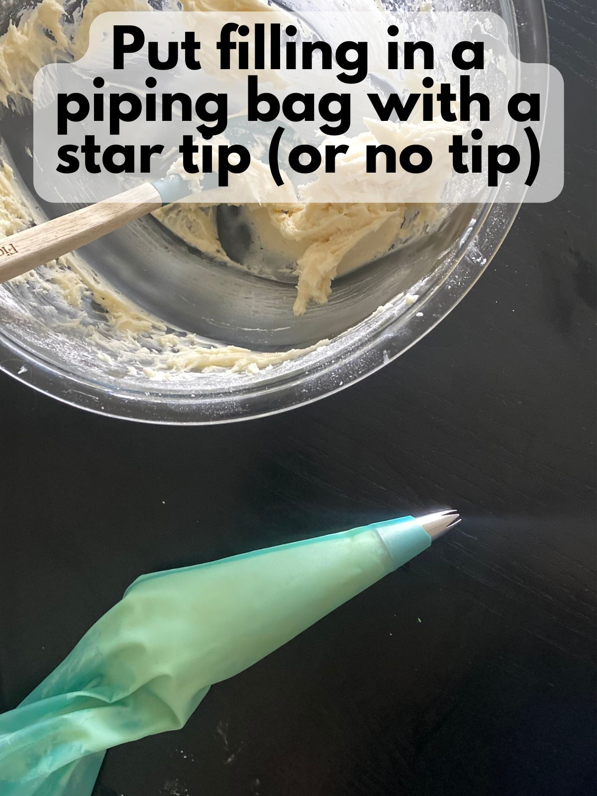 - You can put the filling in a piping bag with a star tip (or no tip!) for pretty presentation if you want to. Spreading with a butter knife also works.