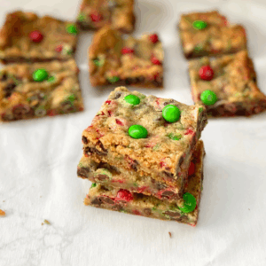 Christmas chocolate chip cookie bars are the kind of dessert that everyone loves: soft, chewy, and loaded with chocolate chips. The festive red and green M&Ms and sprinkles make them sparkle on any holiday table, and they’re quick to prepare since the dough bakes all at once in a pan. These bars are one of the easiest holiday treats you can make, and they’re also fun Christmas desserts to share at parties or give as gifts. Save this recipe to your list of easy Christmas desserts so you’ll have a go-to option for the season.