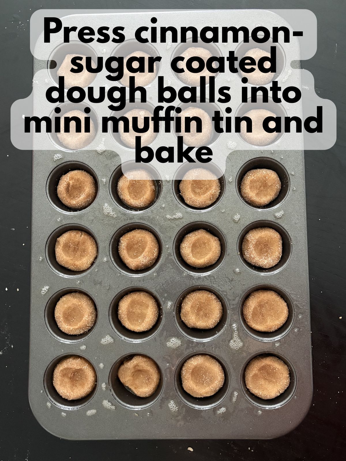 • Scoop the dough into 1-tablespoon portions, roll each one in cinnamon sugar, and place them in the mini muffin pan. Gently press the centers down slightly to form little cups.