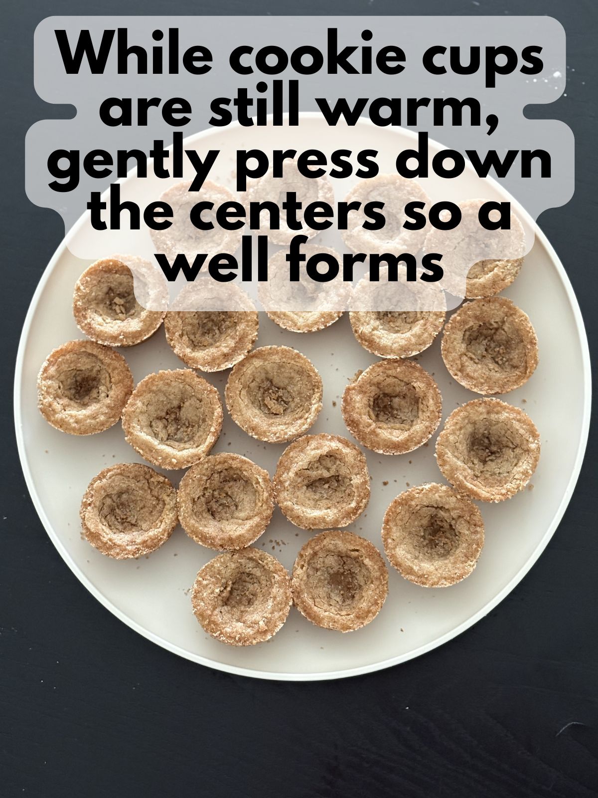 • Let the cookie cups cool in the pan for 10 minutes, then carefully remove them and transfer to a wire rack to cool completely.