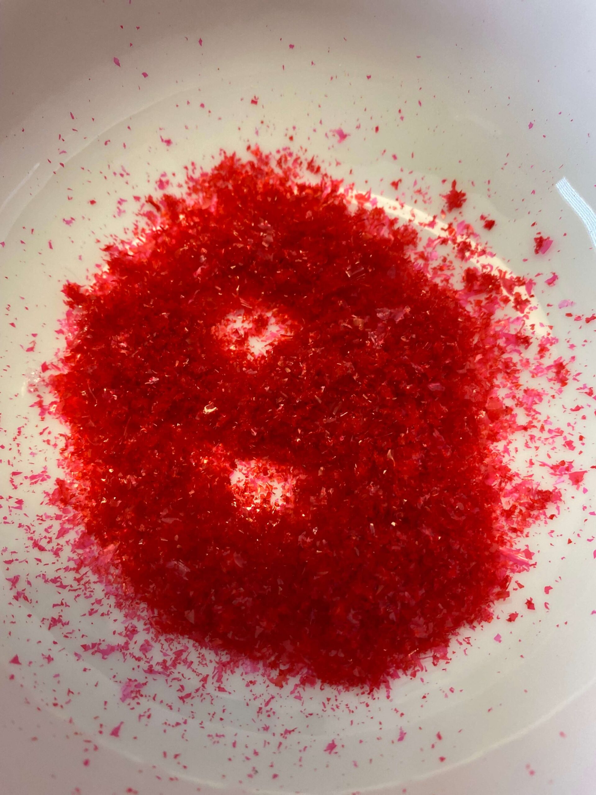 This method I saw on TikTok, and I had to try it! It’s a little more complicated than the first method described here, but it looks like it yields excellent results. Basically, you combine cornstarch and water in a pot and cook until it thickens. Then, you remove it from the heat and add your desired amount of food coloring and mix. After that, you spread a thin layer of your colorful cornstarch mixture on some plastic wrap and let it dry. It will form a flaky, thin paper almost. You put that paper in a blender and grind it up to make a beautiful, edible glitter!