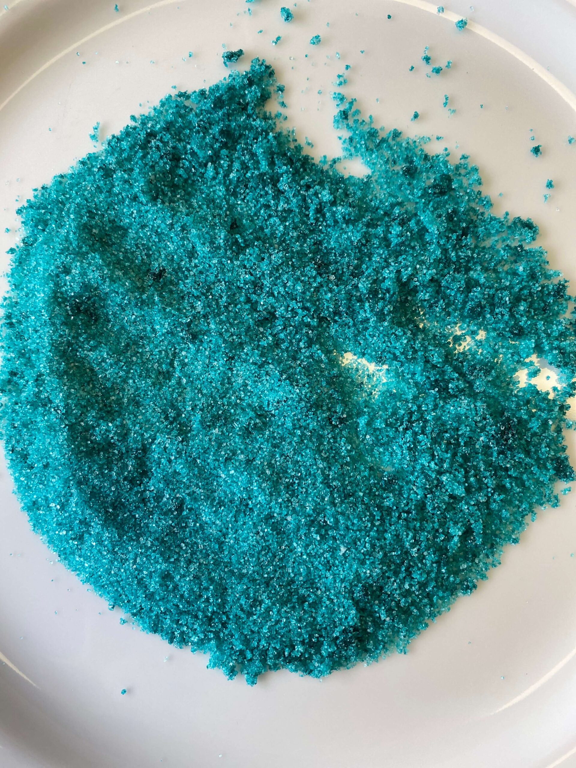 You want your color evenly distributed. It’s better to start off with less food coloring, because you can always add more. Keep mixing that sugar and food coloring until you get the color you want. As you can see, for this experiment, I chose a teal color for this method. I also chose gel food coloring rather than liquid. I don’t know if that made a difference, but I definitely had to stir more than I was expecting in order to get the color evenly distributed!