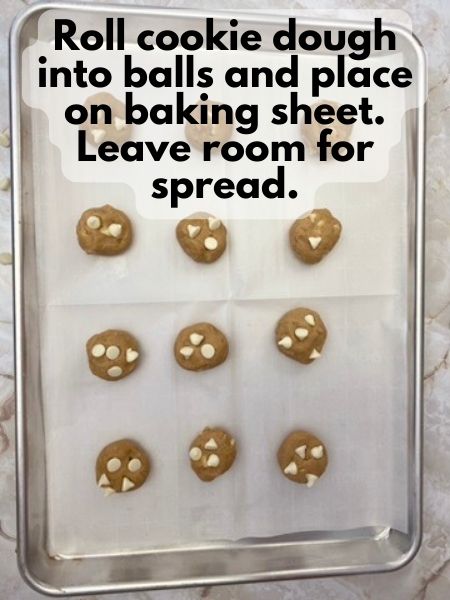 7. Scoop the Dough: Use a cookie scoop or spoon to drop rounded tablespoons of dough onto the prepared baking sheet, spacing them about 2 inches apart. If you like, you can press in some extra white chocolate chips to the outside of your dough balls before bakin.