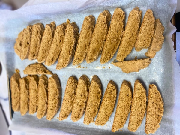 Biscotti can typically be whipped up in 5-10 minutes. You form your dough into 2 (sometimes 1) “loaf” and you take bake it a bit. Then, you take your loaf out and let it cool a bit so you can slice it into biscotti-sized pieces. Finally, you lay your biscotti cut-side down on your cookie sheet and bake them a second time to crisp them up, flipping them halfway through that second bake. That’s it! Really, if you’re a beginning baker, try biscotti. It’s surprisingly easy and absolutely delicious!