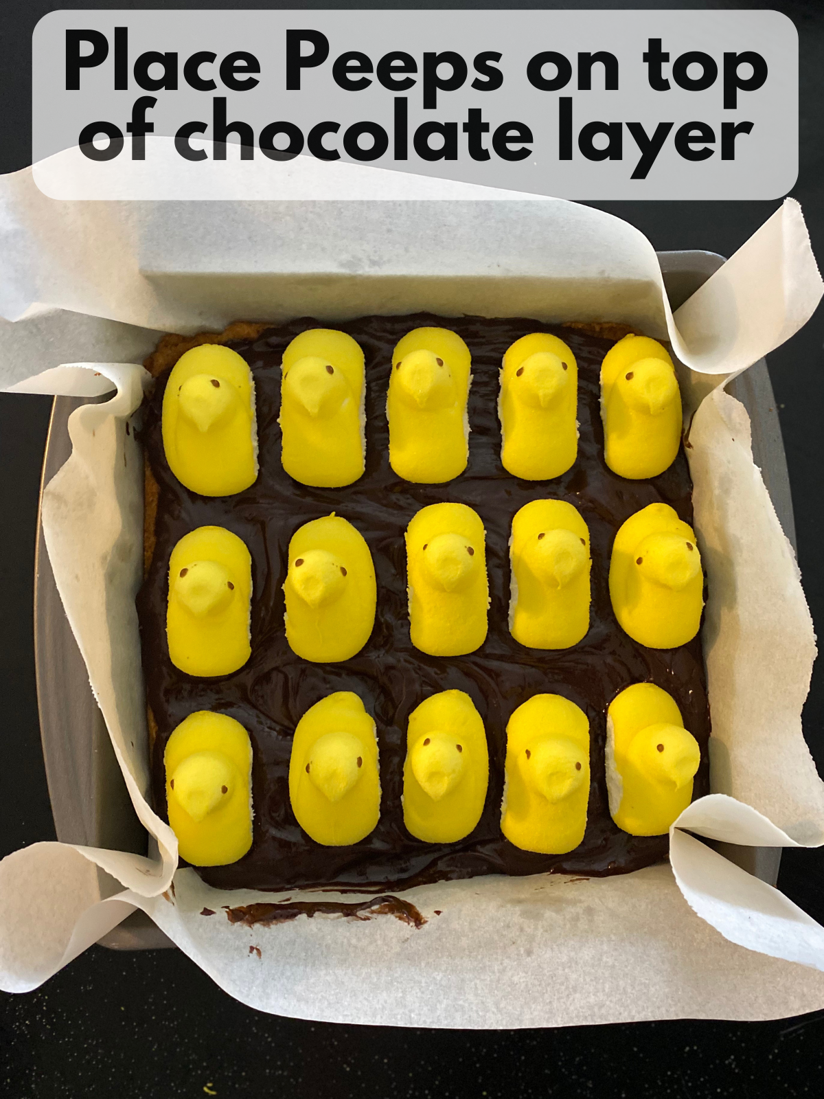 Top with Peeps: Arrange the Peeps in a single layer on top of the ganache. Lightly press them in.