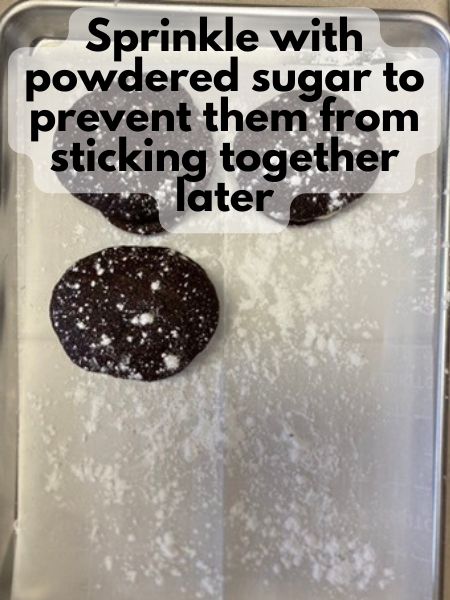 - I recommend storing the whoopie pies in a container lined with parchment paper and sprinkled with powdered sugar, as they get a little sticky.